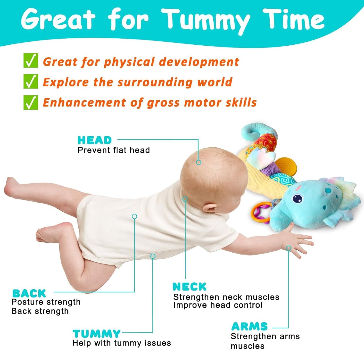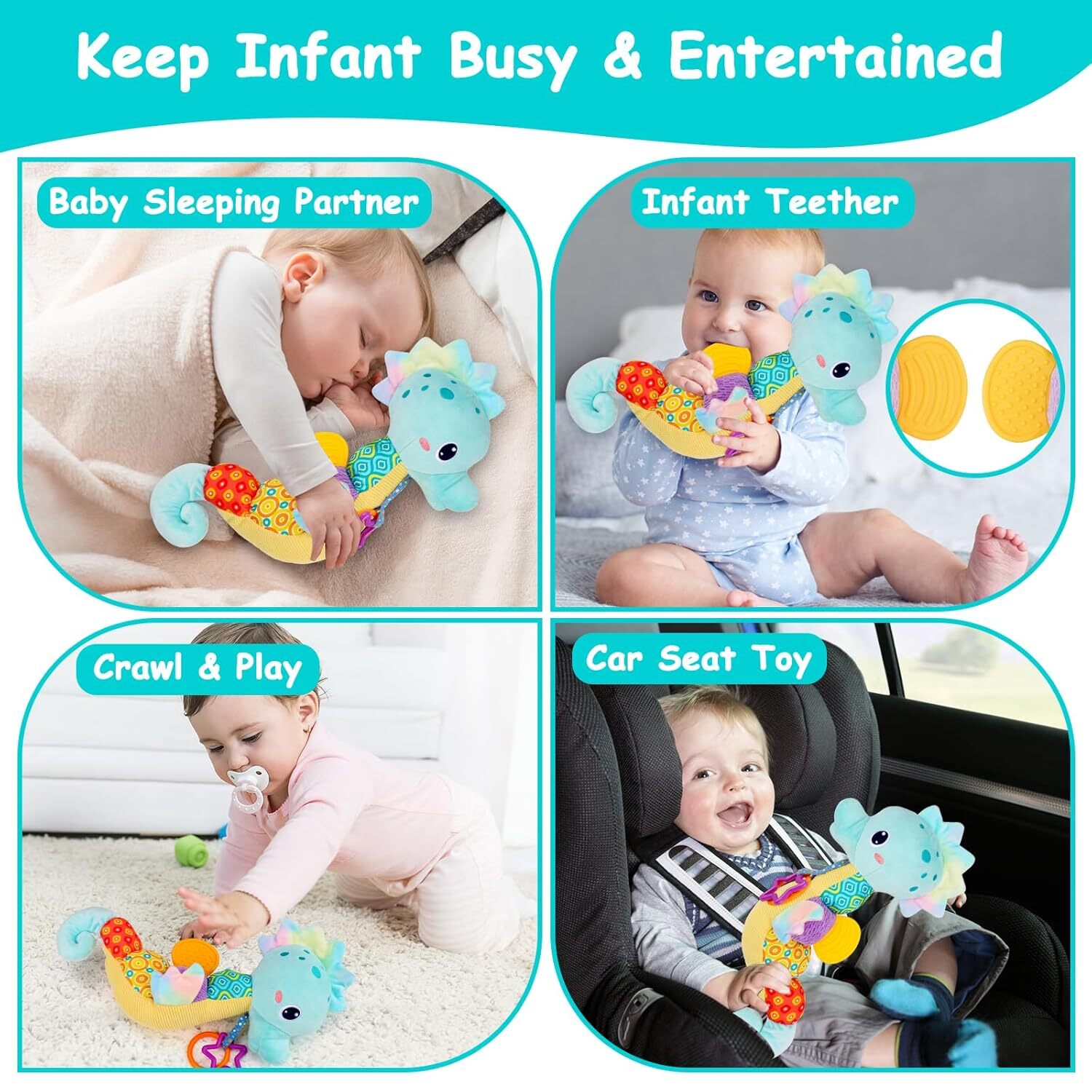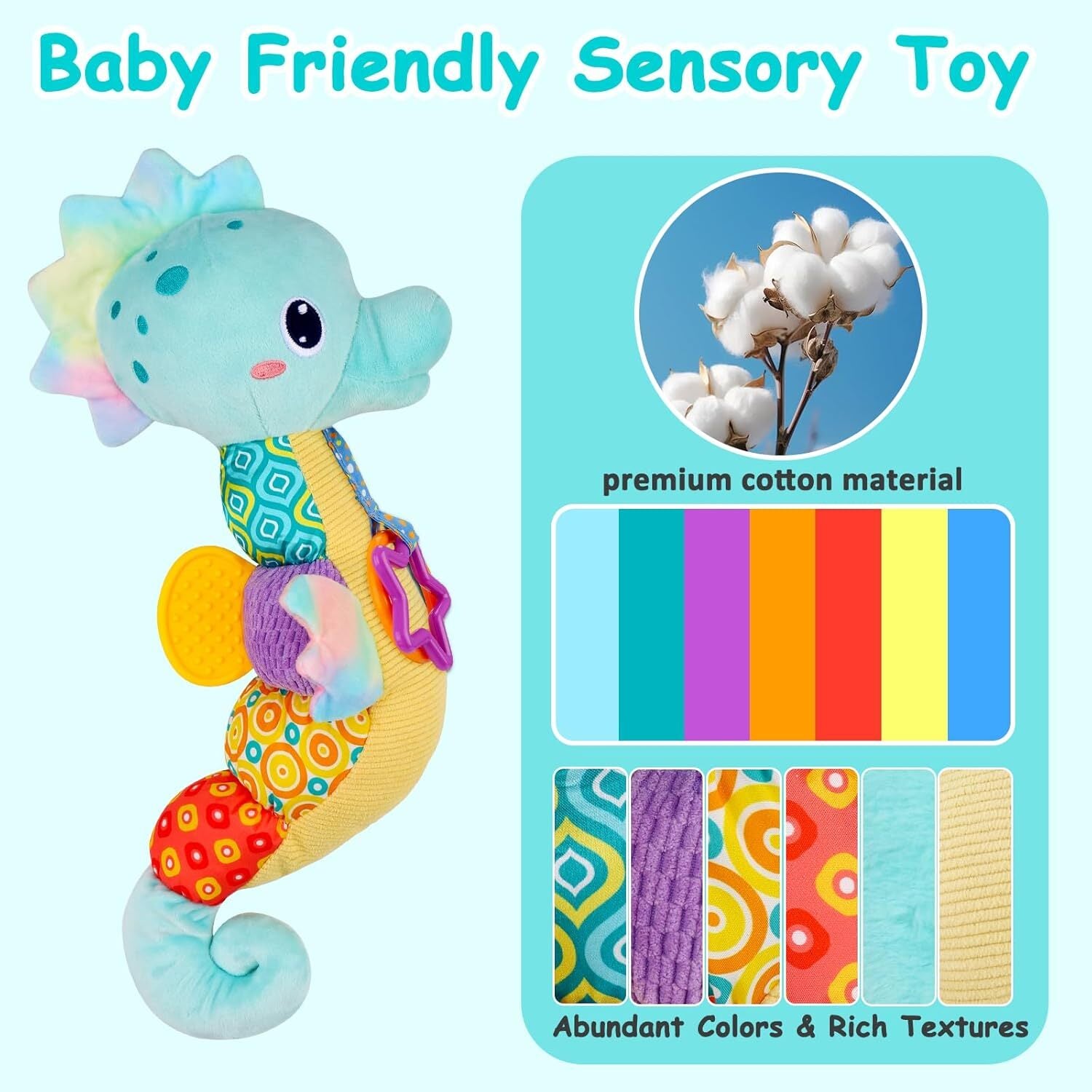 - Colorful & Textured Back: The seahorse’s variety of colors, fabrics, patterns, and textures stimulates baby's vision and touch, capturing and holding their attention.