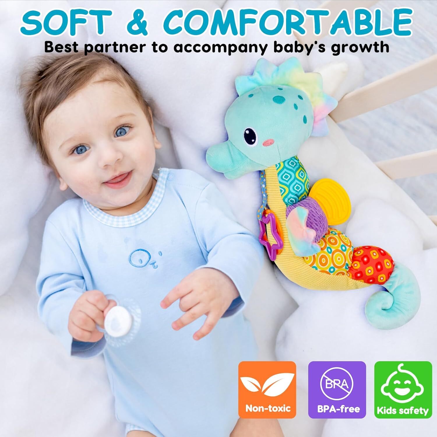 Prioritizing baby safety, the Seahorse Plush Toy is crafted from non-toxic, BPA-free materials and features a teether that your baby can chew on worry-free. Every detail, from its soft fabric to securely stitched components, ensures a safe and long-lasting companion for your little explorer.